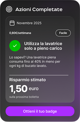 Ti aiuterò a comprendere ed ottimizzare i consumi energetici. Ci sono tante sfide mirate ad ottimizzare l’utilizzo delle tue utenze, impara a risparmiare e ottieni i badge di riconoscimento, non temere, ti guiderò passo dopo passo!